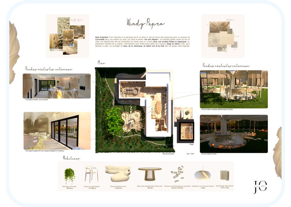 J'ai choisi "IRIS VAN HERPEN", une styliste Néerlandaise connue pour ses créations en 3D et l'usage de matières novatrice. Pour ainsi garder l'esprit du lieu et créer une identité forte afin de transporter les clients dans un univers doux, aux courbes fluides et organiques, représentant l'identité de la styliste. L'atmosphère est chaleureuse grâce aux couleurs beige et crème. Enfin, pour décaler le style, j'ai privilégié du tissu, de la céramique, du béton ciré et du bois afin de garder cette légereté.